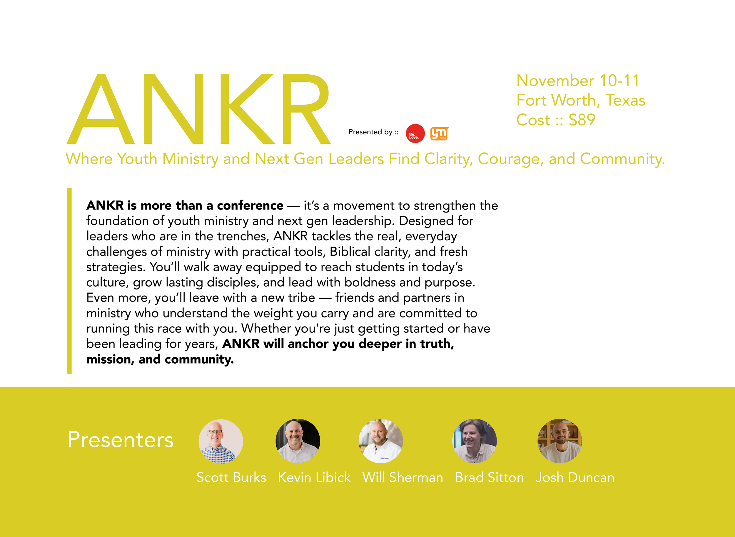 ANKR is more than a conference — it’s a movement to strengthen the foundation of youth ministry and next gen leadership. Designed for leaders who are in the trenches, ANKR tackles the real, everyday challenges of ministry with practical tools, Biblical clarity, and fresh strategies. You’ll walk away equipped to reach students in today’s culture, grow lasting disciples, and lead with boldness and purpose. Even more, you’ll leave with a new tribe — friends and partners in ministry who understand the weight you carry and are committed to running this race with you. Whether you're just getting started or have been leading for years, ANKR will anchor you deeper in truth, mission, and community.